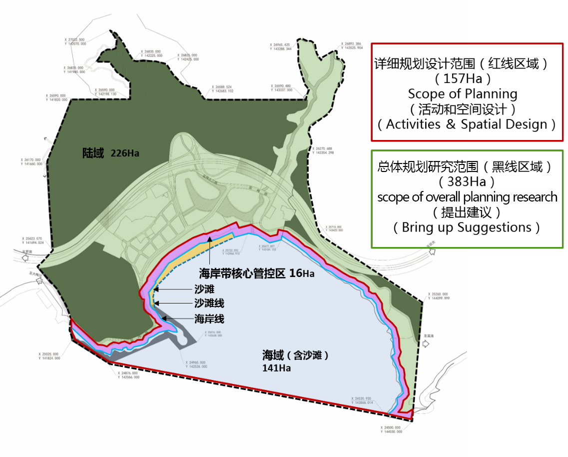 (1)Scope of overall planning research: the research covers two parts: the coastal zone and the land area of Xiaomeisha , totaling about 383 hectares, of which the coastal zone extends about 157 hectares and the land area 226 hectares. It is expected to provide overall planning idea and spatial structure for both parts and detailed planning for the coastal zone.