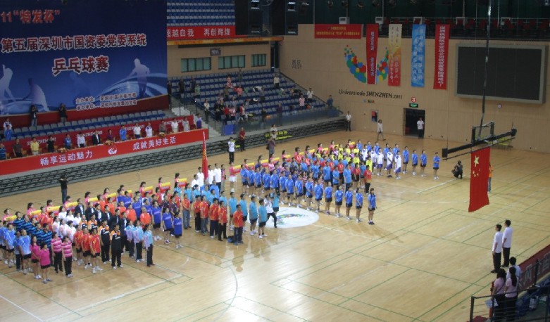 開幕式于10月29日上午8:30舉行。市國資委黨委書記柏立新,特發(fā)集團黨委書記、董事長劉愛群、黨委副書記、總經(jīng)理施長躍,國資委黨辦主任李明、副主任張曉中、唐明通,以及國資委系統(tǒng)企業(yè)的領(lǐng)導(dǎo)出席開幕式。開幕式由集團總經(jīng)理施長躍主持。此時的羅湖體育館一派歡快、濃烈的氛圍:主席臺正面高樹印有本次比賽徽標和“2011‘特發(fā)杯’第五屆深圳市國資委黨委系統(tǒng)乒乓球賽”字樣的巨幅背景板,四周掛滿國資委和系統(tǒng)各企業(yè)的旗幟與祝比賽圓滿成功的條幅,以及“暢享運動魅力,成就美好生活”、“樹競技風(fēng)尚,展國企風(fēng)采”等標語,各單位啦啦隊和觀眾坐滿看臺。伴隨著熱烈歡快的運動員進行曲,來自國資委系統(tǒng)21家單位的22支代表隊,在美麗端莊的引導(dǎo)員帶領(lǐng)下,隨著高舉國資委旗幟的旗手、護旗手依次入場,隊員們意氣風(fēng)發(fā),精神飽滿,步伐矯健,隊列整齊。在全體起立奏唱國歌、莊嚴的升國旗儀式后,集團董事長劉愛群和國資委黨委書記柏立新分別代表承辦方和組委會先后致辭。