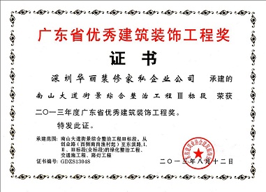 集團(tuán)參股企業(yè)華麗裝修家私企業(yè)公司承建的“南山大道街景綜合整治工程Ⅲ標(biāo)段”繼獲得2012年度深圳裝飾工程金鵬獎(jiǎng)(公裝類)后捷報(bào)頻傳,再一次榮獲廣東省建筑裝飾工程最高榮譽(yù)獎(jiǎng)“廣東省優(yōu)秀建筑裝飾工程獎(jiǎng)”(以下簡(jiǎn)稱“省優(yōu)”)。2013年10月廣東省建筑業(yè)協(xié)會(huì)建筑裝飾分會(huì)授予華麗公司“省優(yōu)”獎(jiǎng)杯、牌匾及證書(shū)。該工程經(jīng)深圳市裝飾行業(yè)協(xié)會(huì)的專家嚴(yán)格檢查評(píng)比之后擇優(yōu)推薦到廣東省建筑業(yè)協(xié)會(huì)建筑裝飾分會(huì),由省建筑業(yè)協(xié)會(huì)建筑裝飾分會(huì)組織廣東省內(nèi)的專家對(duì)“省優(yōu)”申報(bào)資料及現(xiàn)場(chǎng)進(jìn)行嚴(yán)格的考察評(píng)比,經(jīng)“省優(yōu)”評(píng)委會(huì)評(píng)審?fù)ㄟ^(guò),華麗公司再次榮獲殊榮。