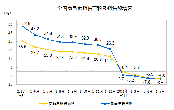 2014年1-5月份,全國房地產(chǎn)開發(fā)投資30739億元,同比名義增長14.7%,增速比1-4月份回落1.7個百分點。其中,住宅投資21043億元,增長14.6%,增速回落2個百分點,占房地產(chǎn)開發(fā)投資的比重為68.5%。